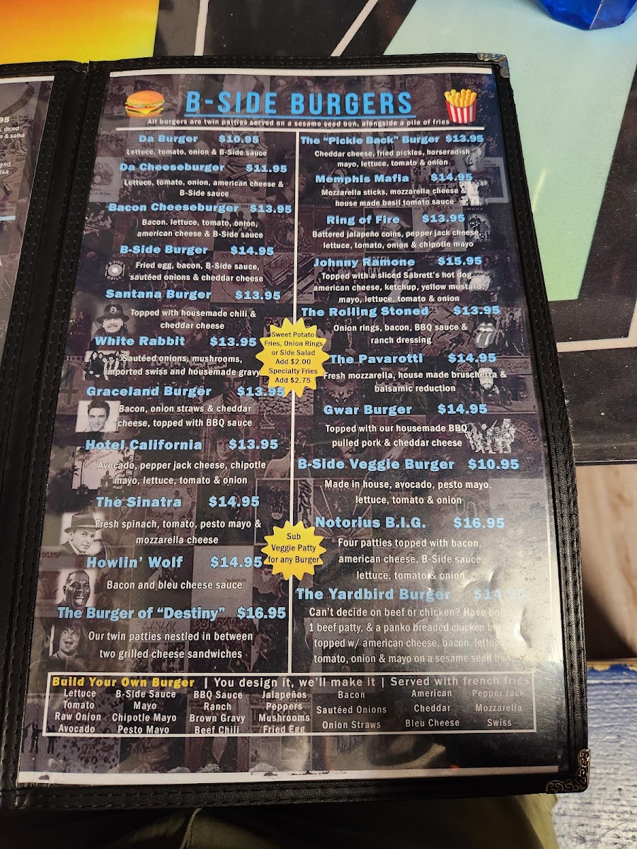 “ A restaurant across the street had a 30 min wait, so my group decided to check the B-Side. Best decision ever!!! We sat down right away. The staff were awesome, the vinyls and posters were right up our alley and even though all of us ordered different things, we were all blown away by our meals (eve the kids). I never leave reviews on places, but halfway through my meal I just had to for this place. 11/10 stars. ”